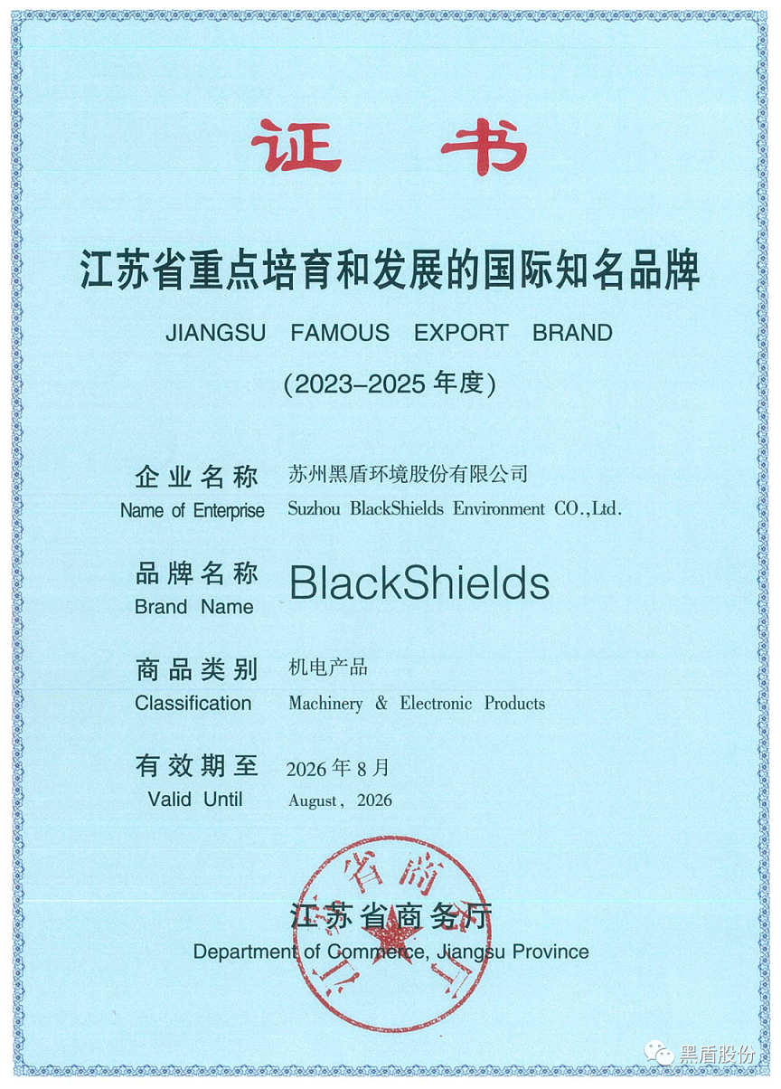 近日,蘇州黑盾環(huán)境股份有限公司旗下的BlackShields品牌被江蘇省商務(wù)廳授予江蘇省重點(diǎn)培育和發(fā)展的國(guó)際知名品牌證書(shū)。