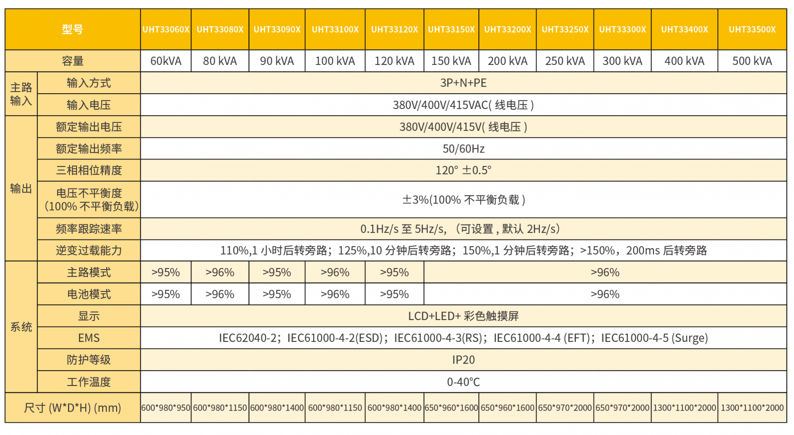 – IGBT調頻智能整流逆變技術,輸入功率因數高達0.99,輸入電流諧波低到3%;輸出電壓電流性能更加優異。強大的過載能力:110-125%的負載可正常運行10分鐘;125-150%的負載可正常運行1分鐘。并具有輸出短路保護能力。